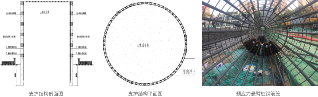 主動控制永久性(拱圈)預應力懸臂樁基坑技術可針對以往必須采用內支撐(周邊無足夠空間)的基坑或無法采用樁錨的外環(huán)形基坑(如古樹保護、山體支護等)進行優(yōu)化,在樁頂和樁深采用預先加載反向應力應變,提前抑制基坑水平荷載和變形,達到節(jié)省工期和造價的目的。相比原方案,基坑造價降低35%-60%,土方造價節(jié)約20%以上,工期節(jié)約50%以上。以往必須采用內支撐(周邊無足夠空間)的基坑或無法采用樁錨的外環(huán)形基坑(如古樹保護、山體支護等)。