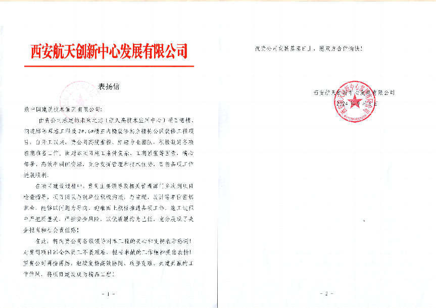 近日,西安航天創(chuàng)新中心發(fā)展有限公司向中國建技發(fā)來表揚信,充分肯定中國建技“未來之芯”項目部的工作,對中國建技高質(zhì)量推進項目建設、優(yōu)質(zhì)履約給予高度評價。