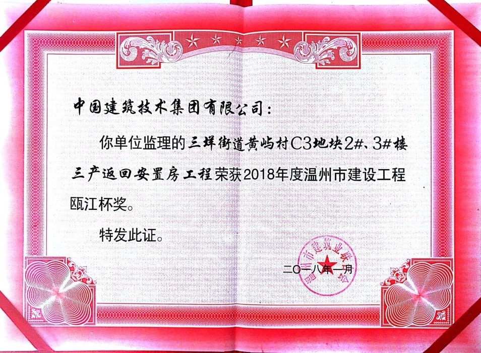 ? ? ? ?近日,溫州住建委、溫州市建筑業(yè)聯(lián)合會(huì)召開表彰大會(huì)。溫州分公司承攬的“溫州市三垟街道黃嶼村C3地塊2#3#樓三產(chǎn)返回安置房”工程監(jiān)理項(xiàng)目榮獲2018年度溫州市優(yōu)質(zhì)工程“甌江杯”獎(jiǎng)。?