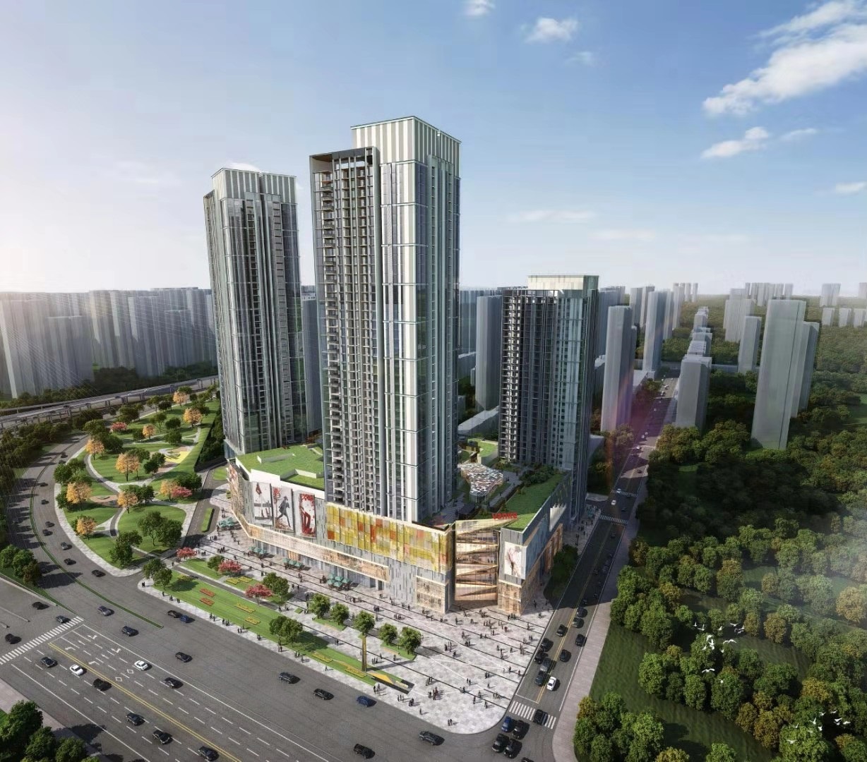 項(xiàng)目為西安萬科金域東郡項(xiàng)目三期工程,包含兩棟超高層住宅、一棟廉租房、以及一座商業(yè)綜合體。其中商業(yè)部分的浐灞印象城為萬科集團(tuán)印力西安城市公司繼龍首印象城、太白印象城之后布局西北的第三座印象城。浐灞印象城從社區(qū)生活這一公共議題出發(fā),重構(gòu)商業(yè)、生活、人之間的關(guān)系,通過15min便民圈的業(yè)態(tài)、社區(qū)生活理念以及寵物友好的空間等新功能,讓社區(qū)成為連接日常的樞紐,革新了西安城東的商業(yè)格局。商場(chǎng)已于2023年端午節(jié)盛大開業(yè),包含餐飲、影院、購(gòu)物、兒童游樂等多種業(yè)態(tài),極大的方便了辛家廟片區(qū)居民的日常生活。廉租房已于2022年底交付政府,三棟超高層已于2023年11月30日交付業(yè)主。