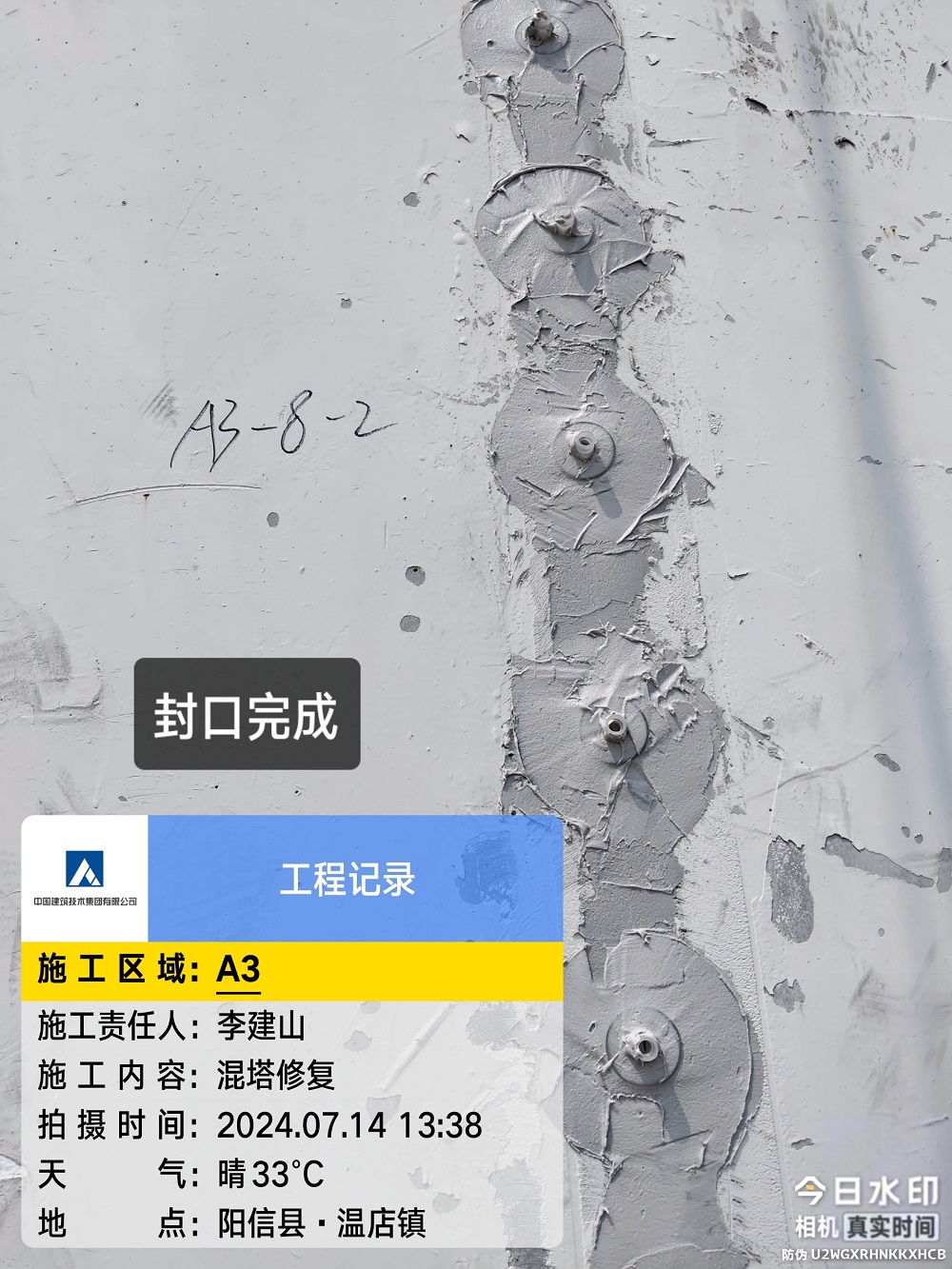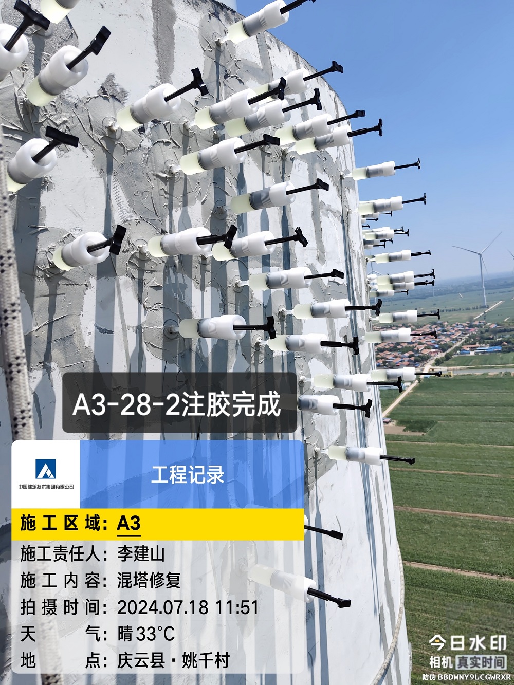山東省德州市的中廣核慶云尚堂風電場位于山東省德州市慶云縣尚堂鎮(zhèn)。WD195-5000型風電機組,混凝土部分為預制裝配式結構,混塔總高110.03m,共28層。M01~M26高3.99m,M27高3.60m,M28高2.4m。M01~M07外徑7800mm,M09~M14外徑6600mm,M16~M28外徑5400mm,M08、M15為過度節(jié)段。除門洞位置外,M01管片壁厚為300mm,M02~M27管片底部壁厚300mm,M28管片底部壁厚1050mm。M01~M15各由兩個C型管片組成,通過豎縫插筋連接并灌漿,組成完整O型管片。管片M16~M28為完整的預制O型管片。我單位需對塔筒節(jié)間縫隙重新補膠,并對個別塔進行空鼓、掉塊及裂縫進行修復。