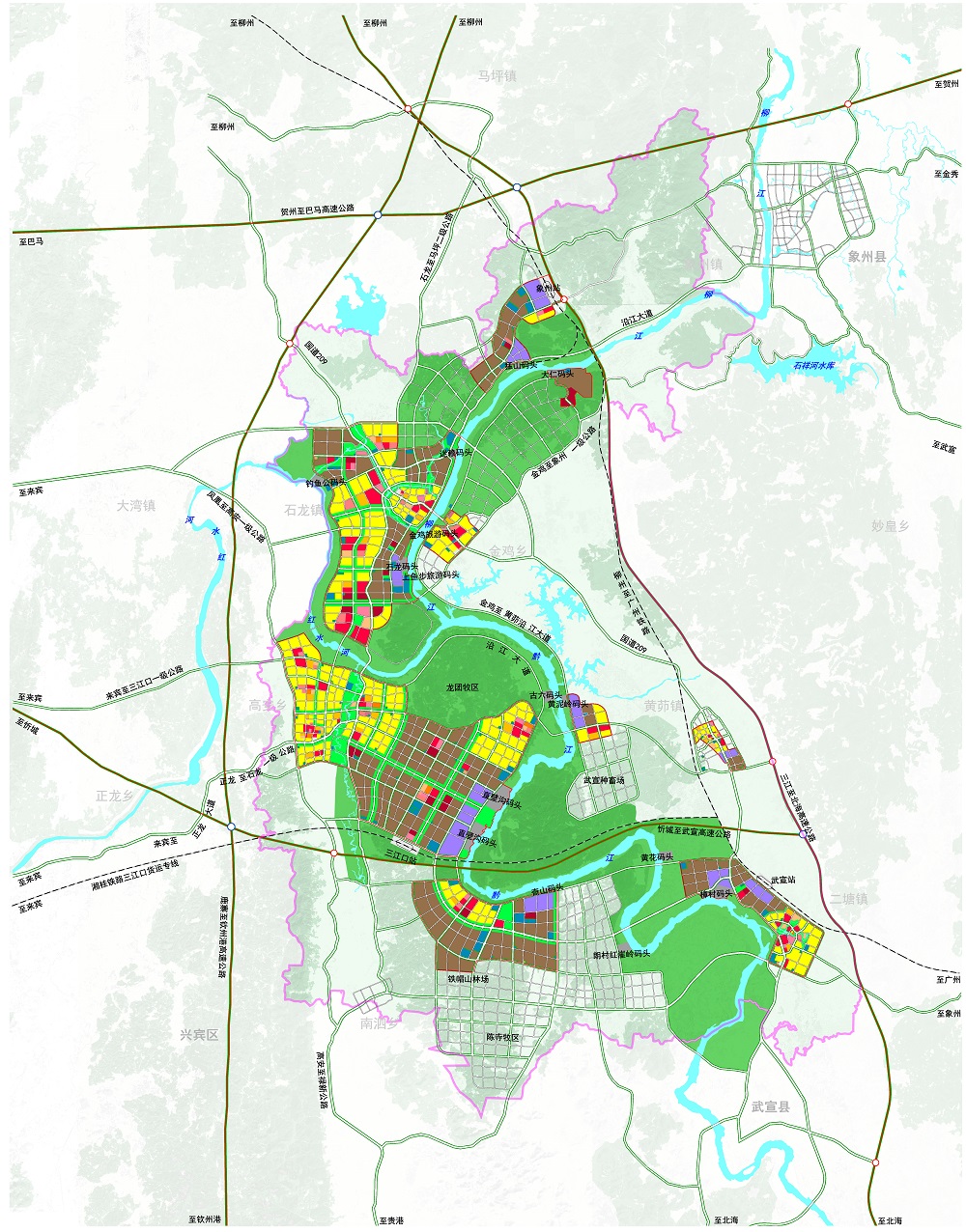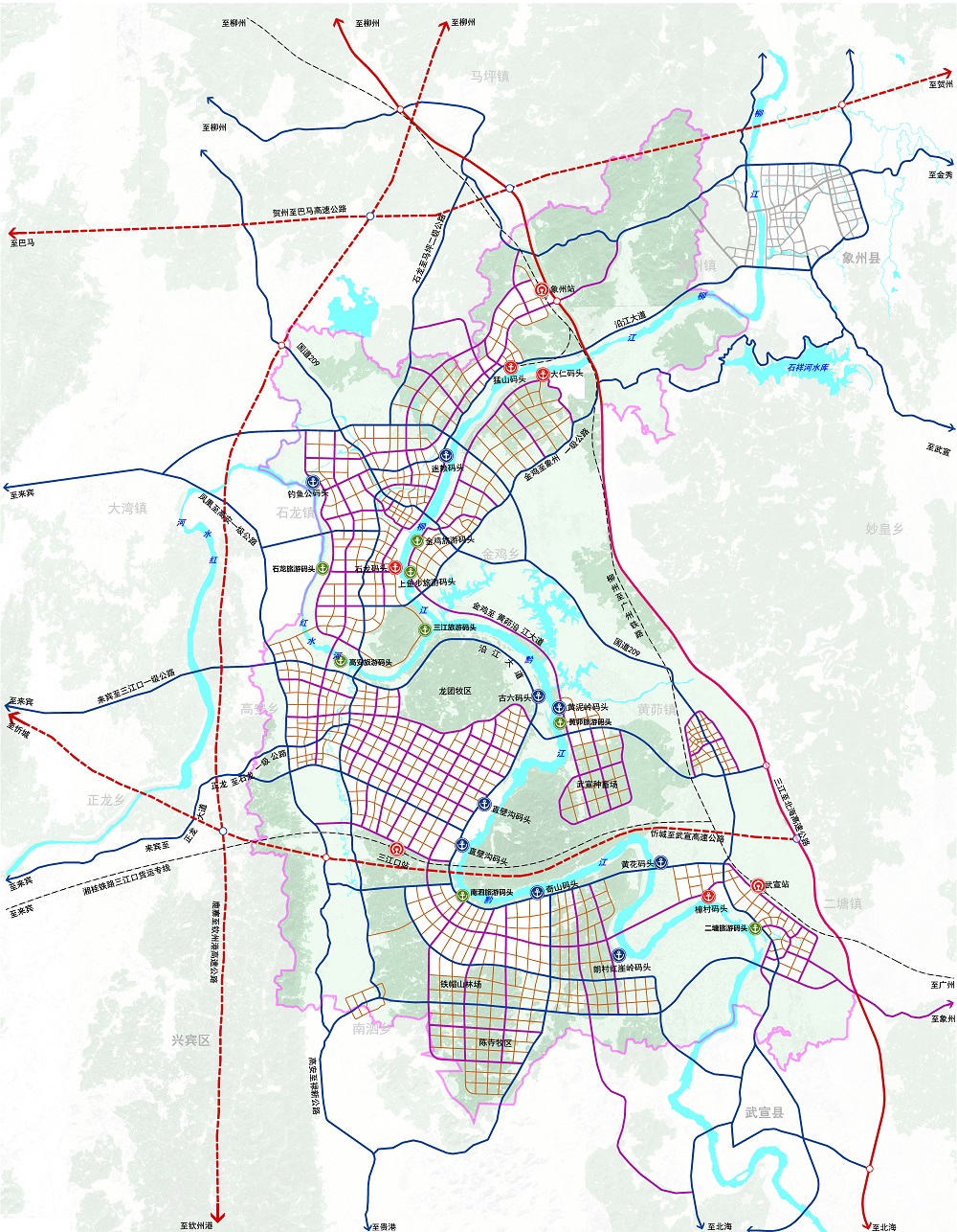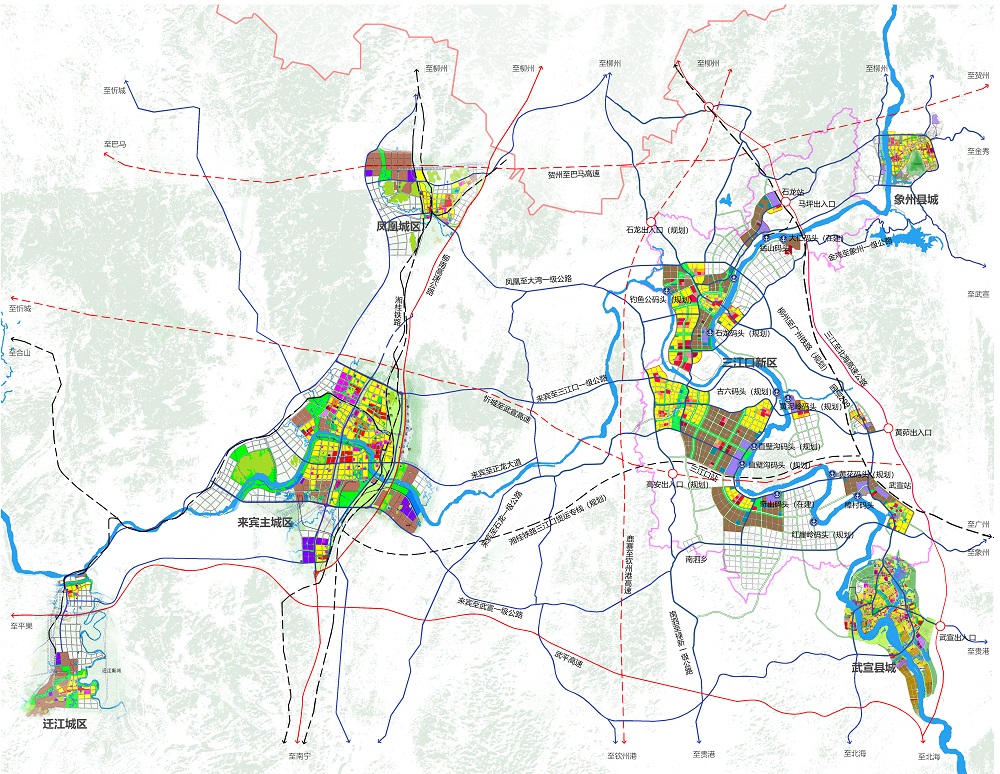 高效綜合交通系統(tǒng)規(guī)劃——以區(qū)域性交通互聯(lián)互通為突破點(diǎn),形成以港口、鐵路、公路為核心的多式聯(lián)運(yùn)對(duì)外綜合交通體系,強(qiáng)化以港口碼頭為中心建設(shè)通往柳州、河池等周邊城市以及通往粵港澳大灣區(qū)城市的黃金水道;重點(diǎn)推進(jìn)三江口新區(qū)產(chǎn)業(yè)組團(tuán)與國道209、國道355等區(qū)域性交通干道的銜接;完善以港區(qū)港口為支點(diǎn)的港產(chǎn)城融合發(fā)展體系:加快石龍碼頭、直壁溝碼頭、黃泥嶺碼頭及其配套設(shè)施的建設(shè),以港口為依托,完善集疏運(yùn)體系,促進(jìn)港口與腹地經(jīng)濟(jì)良性循環(huán)發(fā)展,驅(qū)動(dòng)新區(qū)從“碼頭經(jīng)濟(jì)”走向港產(chǎn)城融合發(fā)展。