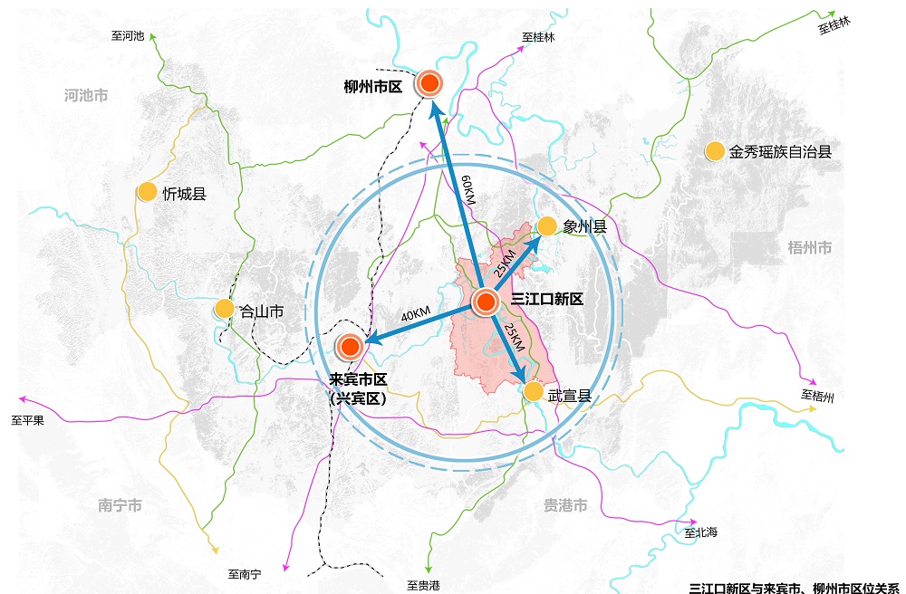 來賓市地處廣西中部地區(qū),緊鄰柳州、南寧兩大核心城市,北距柳州約65公里,西南距南寧約140公里,有“桂中腹地”之稱。三江口新區(qū)位于來賓市東部,是桂中“金三角”核心,也是“西江黃金水道重要節(jié)點(diǎn)”和“南柳經(jīng)濟(jì)走廊重要節(jié)點(diǎn)”,區(qū)位優(yōu)勢(shì)明顯。
