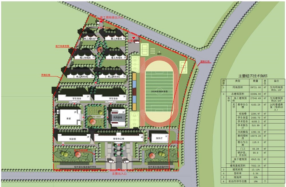 ???本項(xiàng)目用地位于日喀則市經(jīng)濟(jì)開發(fā)區(qū),辦學(xué)規(guī)模為24班的小學(xué),包括教學(xué)樓、實(shí)驗(yàn)樓、食堂、風(fēng)雨操場、宿舍樓等建筑。規(guī)劃建設(shè)用地為59721㎡,建筑總面積為32456.5㎡,其中地上建筑面積27540.69㎡,地下建筑面積4915.81㎡。建筑密度13.11%,容積率0.54,綠地率30%,機(jī)動(dòng)車停車位數(shù)196個(gè)。南側(cè)、東側(cè)、北側(cè)為規(guī)劃道路,西側(cè)緊鄰規(guī)劃曲布幼兒園和園丁苑。