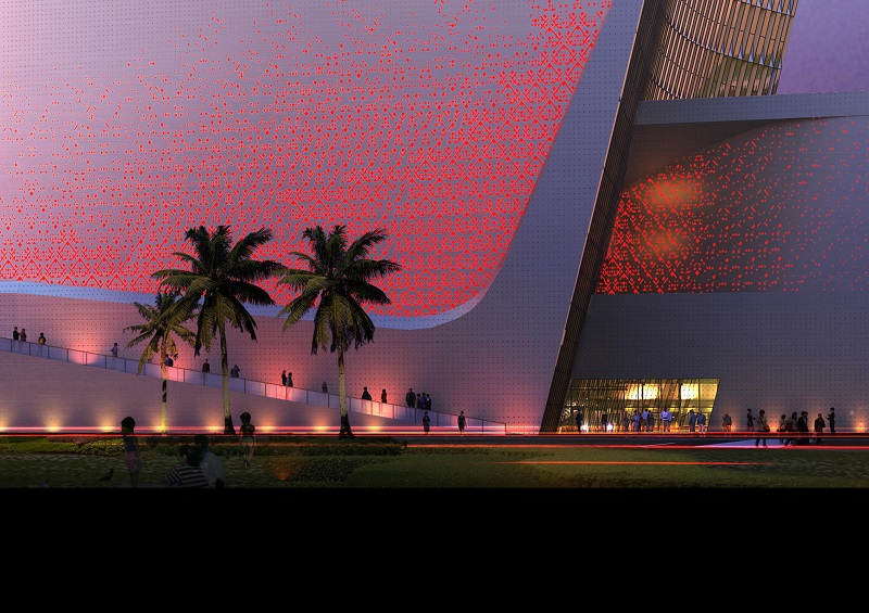 建筑外飾面以穿孔金屬幕墻及玻璃幕墻為主,強(qiáng)調(diào)建筑虛實(shí)對(duì)比,造型整體舒展大氣,極具動(dòng)態(tài)。建筑立面注重細(xì)部處理,淺銀灰色金屬質(zhì)感的菱形穿孔鋁板,以若干通透率的組合,拼接成漸變過渡的視覺效果,細(xì)節(jié)融入海南黎錦圖案意象,寓意地域非遺傳統(tǒng)文化的精髓。鋁板開孔圖案襯以夜景燈,晝間夜間將呈現(xiàn)不同的立面效果。