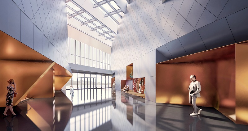 建筑方案以“海上帆、風(fēng)中翼、云上錦”為總體設(shè)計(jì)理念,采用“一體兩翼”的規(guī)劃格局,力求以鮮明獨(dú)特的建筑形象,充分展現(xiàn)在建設(shè)自貿(mào)港這一新時(shí)代背景下海南地域文化的“展示與弘揚(yáng)、傳播與交流、騰飛與發(fā)展”。整體建筑造型如海上揚(yáng)帆的造型高低錯(cuò)落呼應(yīng),建筑形體面向東側(cè)城市廣場(chǎng)開敞,又如張開的親和雙臂,將漫步人群攬入其中,把從西北西南街角引入的城市人群,會(huì)聚于建筑中心設(shè)有共享、咖啡、新聞發(fā)布等休閑互動(dòng)區(qū)的“城市文化客廳”,并將建筑空間自然劃分為南北兩翼,即位于北側(cè)的瓊劇會(huì)館劇場(chǎng)與南側(cè)的非遺藝術(shù)博物館區(qū),宛如展翅欲飛的“風(fēng)中雙翼”,迎海上來風(fēng)。