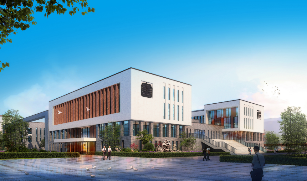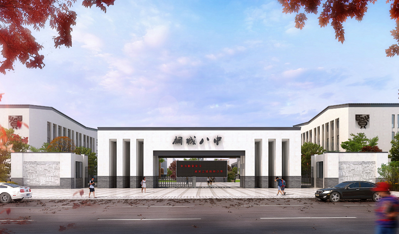 建筑理念——校園的歷史原型:“辟雍”體現(xiàn)了“天圓地方”的中國傳統(tǒng)宇宙觀。整個校園立面材質以黑、白、灰為基調,取徽派建筑之精華、融合現(xiàn)代建筑設計手法,脫離于傳統(tǒng),不失其韻味。中心造型力求現(xiàn)代、空靈、內(nèi)蘊,輪廓線平緩、舒展,塑造出桐城市第八中學的現(xiàn)代風貌。布局上,中心雕塑作為整體校園的核心,圍繞中心雕塑設置行政綜合樓、高一、高二教學實驗樓和高三教學樓。