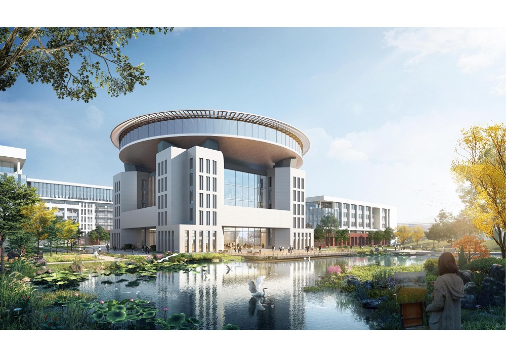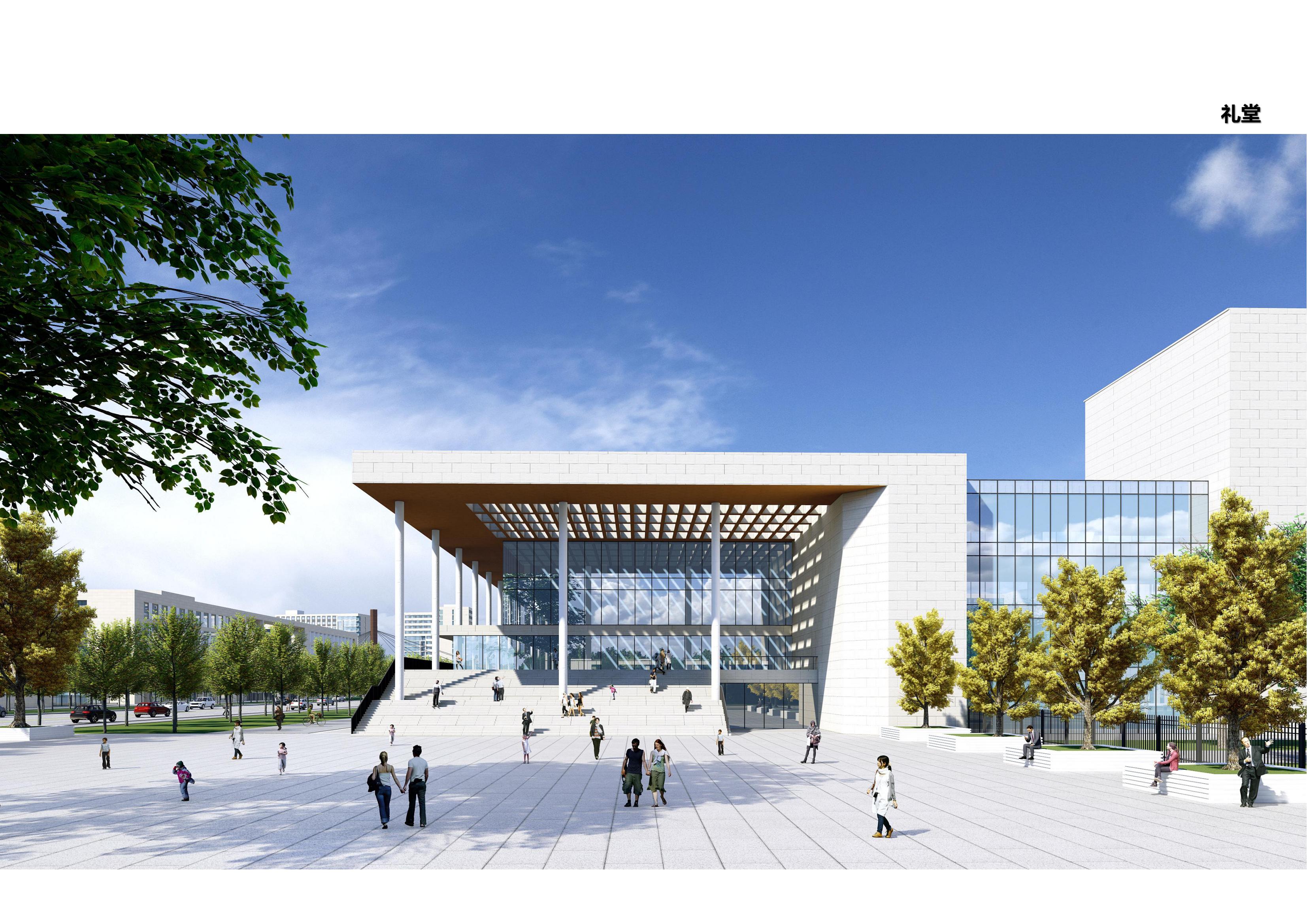 項(xiàng)目核心文化建筑:圖書館與圖書綜合樓,采用左右對(duì)仗形式設(shè)置于東西校區(qū)中心位置。圖書綜合樓以“圓”為頂;圖書館以“方”為體,體現(xiàn)“天圓地方” 的中國(guó)傳統(tǒng)宇宙觀 。