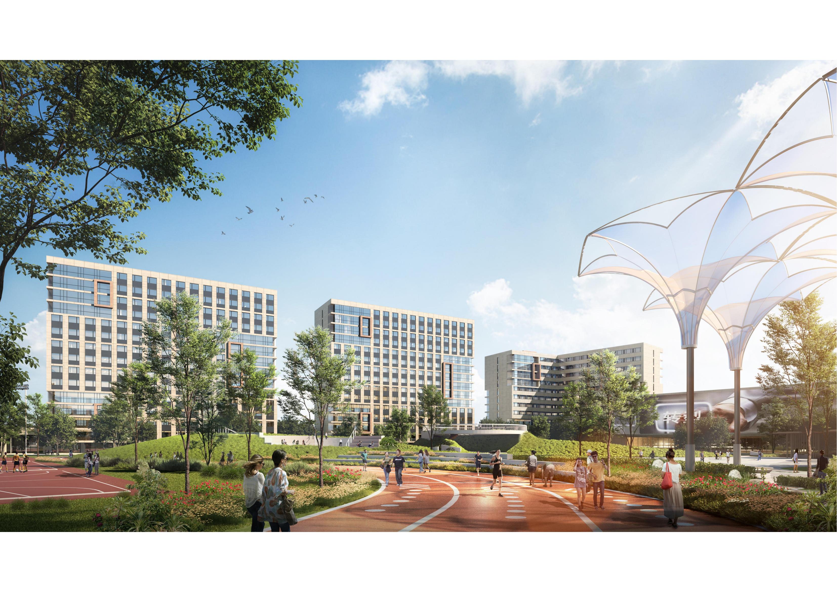 項(xiàng)目總占地426.83畝,以“自成一城”的氣勢(shì)跳出了現(xiàn)有格局。在前期規(guī)劃設(shè)計(jì)中,我們借鑒了《周禮·考工記》中“匠人營(yíng)國(guó),方九里,旁三門。國(guó)中九經(jīng)九緯,經(jīng)涂九軌?!焙汀澳蠄@北苑,前朝后市”的中國(guó)傳統(tǒng)城市營(yíng)造手法,同時(shí)融入本土中原文化符號(hào),引古論今,從城市層面打造屬于棗莊的“花園校園”。