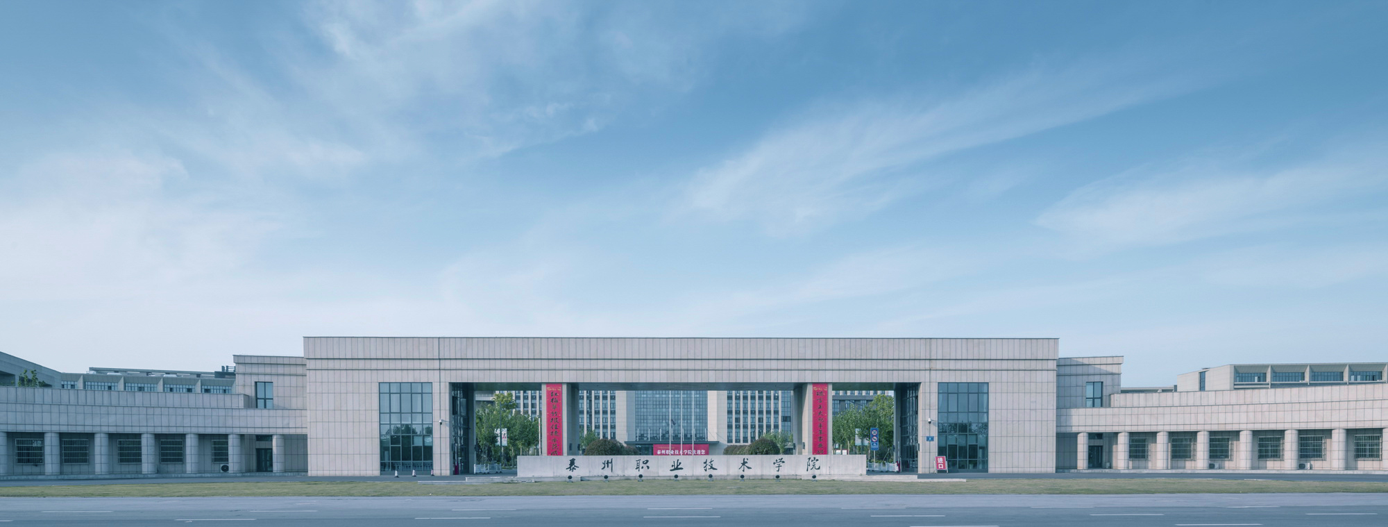 本項目為泰州職業(yè)技術(shù)學(xué)院中國醫(yī)藥城新校區(qū)規(guī)劃與建筑方案。選址于泰州中國醫(yī)藥城境內(nèi)。規(guī)劃用地面積約1061 畝。設(shè)計規(guī)劃在校學(xué)生10000人,教職員工670 余人。實際用地面積約54萬平方米,一期設(shè)計總建筑面積約27.98萬平方米。實際本單位完成施工圖涵蓋建筑面積約16.54萬平方米。