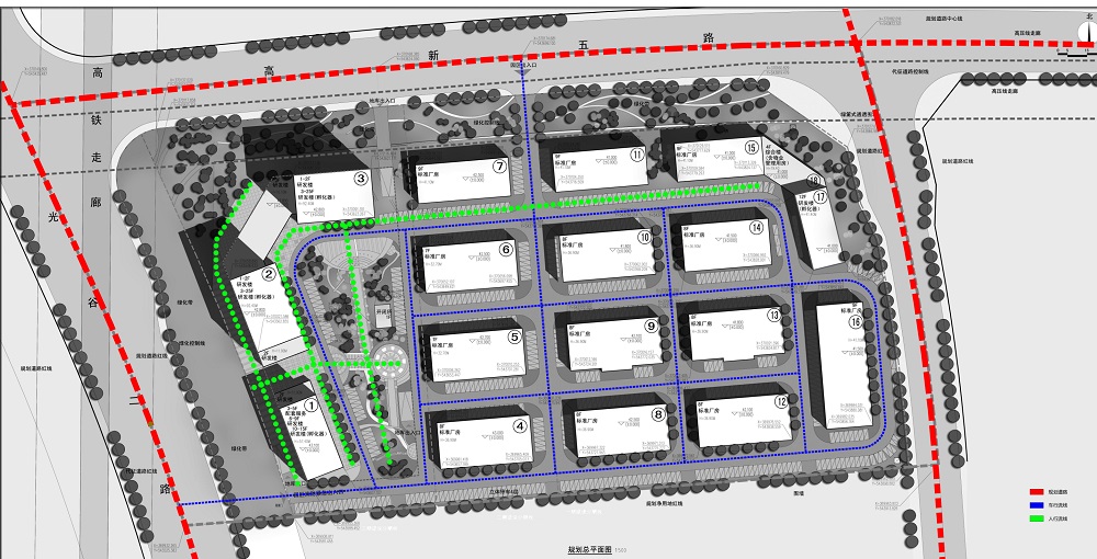 根據(jù)對場地周邊環(huán)境及場地本身的特點,結(jié)合高新區(qū)規(guī)劃局的規(guī)劃設(shè)計要求,本方案分別在光谷二路及高新五路布置主要出入口,結(jié)合中心花園設(shè)計,通過南北、東西方向兩條主要視覺景觀軸線塑造園區(qū)良好的景觀形象。從而打造高檔建筑標準,優(yōu)異的環(huán)境品質(zhì)新型高端研發(fā)生產(chǎn)園區(qū)。建筑空間布局北高南低,在高新五路與光谷二路交叉口處設(shè)置兩棟標志性25層孵化器研發(fā)大樓。沿高新五路設(shè)置9層研發(fā)車間,基地內(nèi)部建筑層數(shù)高低錯落,整個建筑群天際線變化豐富。