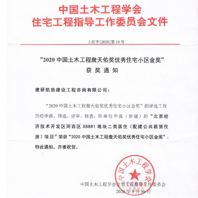 近日,建研凱勃建設(shè)工程咨詢有限公司(以下簡(jiǎn)稱“建研凱勃”)監(jiān)理的北京經(jīng)濟(jì)技術(shù)開(kāi)發(fā)區(qū)河西區(qū)X88R1地塊二類居?。ㄅ浣ü沧赓U住房)項(xiàng)目榮獲2020中國(guó)土木工程詹天佑獎(jiǎng)優(yōu)秀住宅小區(qū)金獎(jiǎng),這是繼該項(xiàng)目獲得北京市結(jié)構(gòu)長(zhǎng)城杯金質(zhì)獎(jiǎng)后的又一重大獎(jiǎng)項(xiàng)。