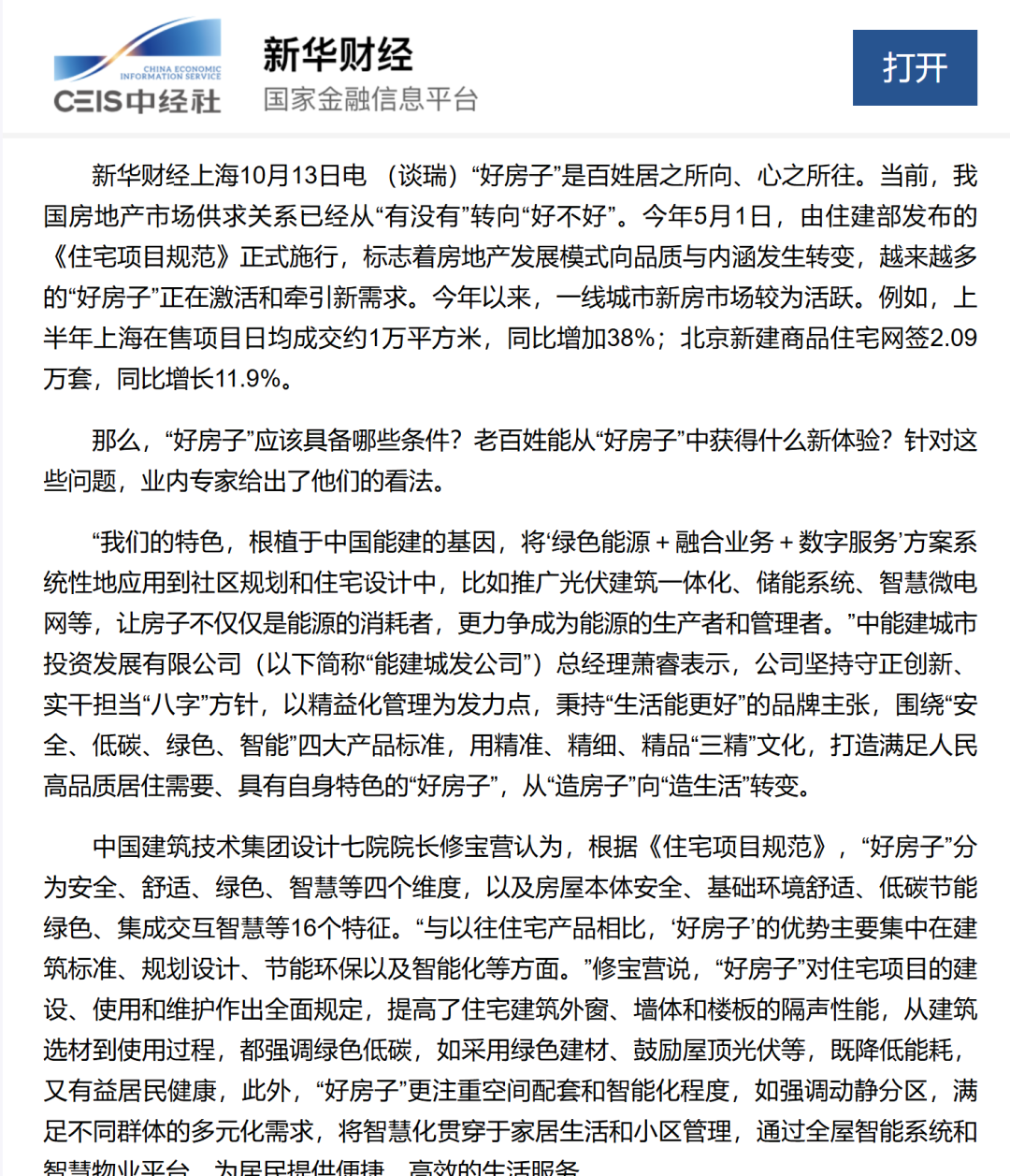 近日,“好房子”建設(shè)成為行業(yè)關(guān)注焦點(diǎn)——中國(guó)建技與中國(guó)能源建設(shè)股份有限公司(以下簡(jiǎn)稱“中國(guó)能建”)在“好房子”領(lǐng)域的探索與實(shí)踐,獲新華財(cái)經(jīng)、央廣網(wǎng)、國(guó)資委官網(wǎng)、《中國(guó)證券報(bào)》等主流媒體高頻報(bào)道。多層次、立體化的傳播矩陣不僅讓相關(guān)話題迅速破圈,單條報(bào)道最高閱讀量更突破130萬,充分彰顯兩家企業(yè)在“好房子”建設(shè)中的行業(yè)引領(lǐng)力,也印證了“好房子”理念與百姓宜居宜業(yè)需求的深度契合。