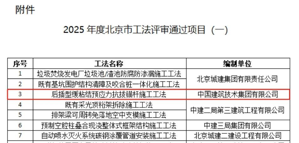 近日,由中國建技申報(bào)的“后插型緩粘結(jié)預(yù)應(yīng)力抗拔錨桿施工工法”通過了北京市住房和城鄉(xiāng)建設(shè)委員會組織的北京市工法專家評審,這一成果標(biāo)志著中國建技在技術(shù)創(chuàng)新、施工質(zhì)量和項(xiàng)目管理等方面實(shí)現(xiàn)了新的突破。
