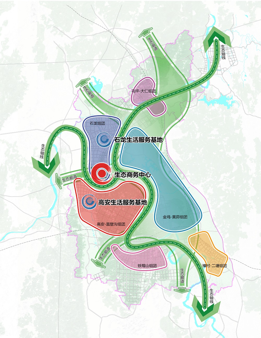 大開大合空間結(jié)構(gòu)——著眼于自然生態(tài)特質(zhì),以水為脈、綠為基、路為廊形成大開的生態(tài)空間,以高度復(fù)合的產(chǎn)業(yè)功能組團(tuán)形成大合的發(fā)展空間,構(gòu)建一個(gè)中心、兩大服務(wù)基地、三大生態(tài)軸線、五大生態(tài)廊道、六大組團(tuán)的空間發(fā)展格局。