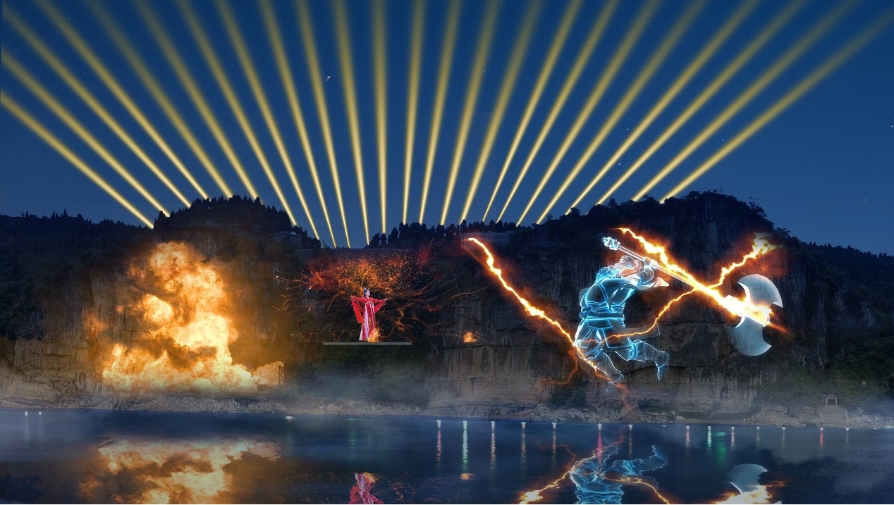 崖壁5D燈光秀尤為新穎,采用“崖壁投影+舞臺(tái)演繹”的方式,以兩側(cè)崖壁為投影載體,中間布置小舞臺(tái)配合燈光矩陣,將辛女與盤瓠的凄美愛(ài)情故事和妖怪來(lái)襲國(guó)破山河場(chǎng)面,將軍點(diǎn)兵出征的戲劇場(chǎng)面演繹得活靈活現(xiàn)。