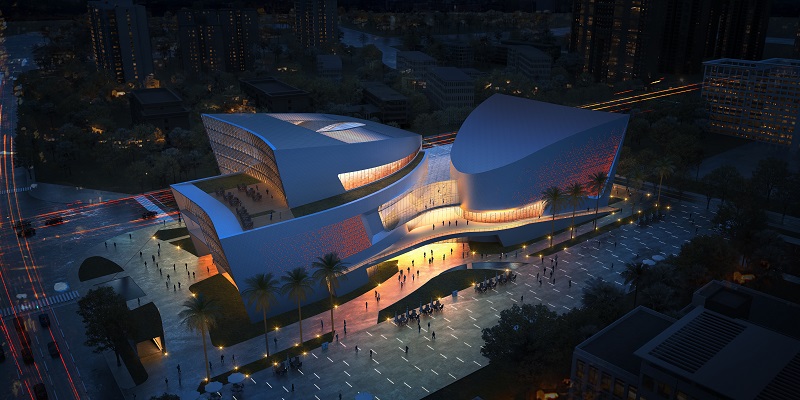 建筑方案以“海上帆、風(fēng)中翼、云上錦”為總體設(shè)計(jì)理念,采用“一體兩翼”的規(guī)劃格局,力求以鮮明獨(dú)特的建筑形象,充分展現(xiàn)在建設(shè)自貿(mào)港這一新時(shí)代背景下海南地域文化的“展示與弘揚(yáng)、傳播與交流、騰飛與發(fā)展”。整體建筑造型如海上揚(yáng)帆的造型高低錯(cuò)落呼應(yīng),建筑形體面向東側(cè)城市廣場(chǎng)開敞,又如張開的親和雙臂,將漫步人群攬入其中,把從西北西南街角引入的城市人群,會(huì)聚于建筑中心設(shè)有共享、咖啡、新聞發(fā)布等休閑互動(dòng)區(qū)的“城市文化客廳”,并將建筑空間自然劃分為南北兩翼,即位于北側(cè)的瓊劇會(huì)館劇場(chǎng)與南側(cè)的非遺藝術(shù)博物館區(qū),宛如展翅欲飛的“風(fēng)中雙翼”,迎海上來風(fēng)。